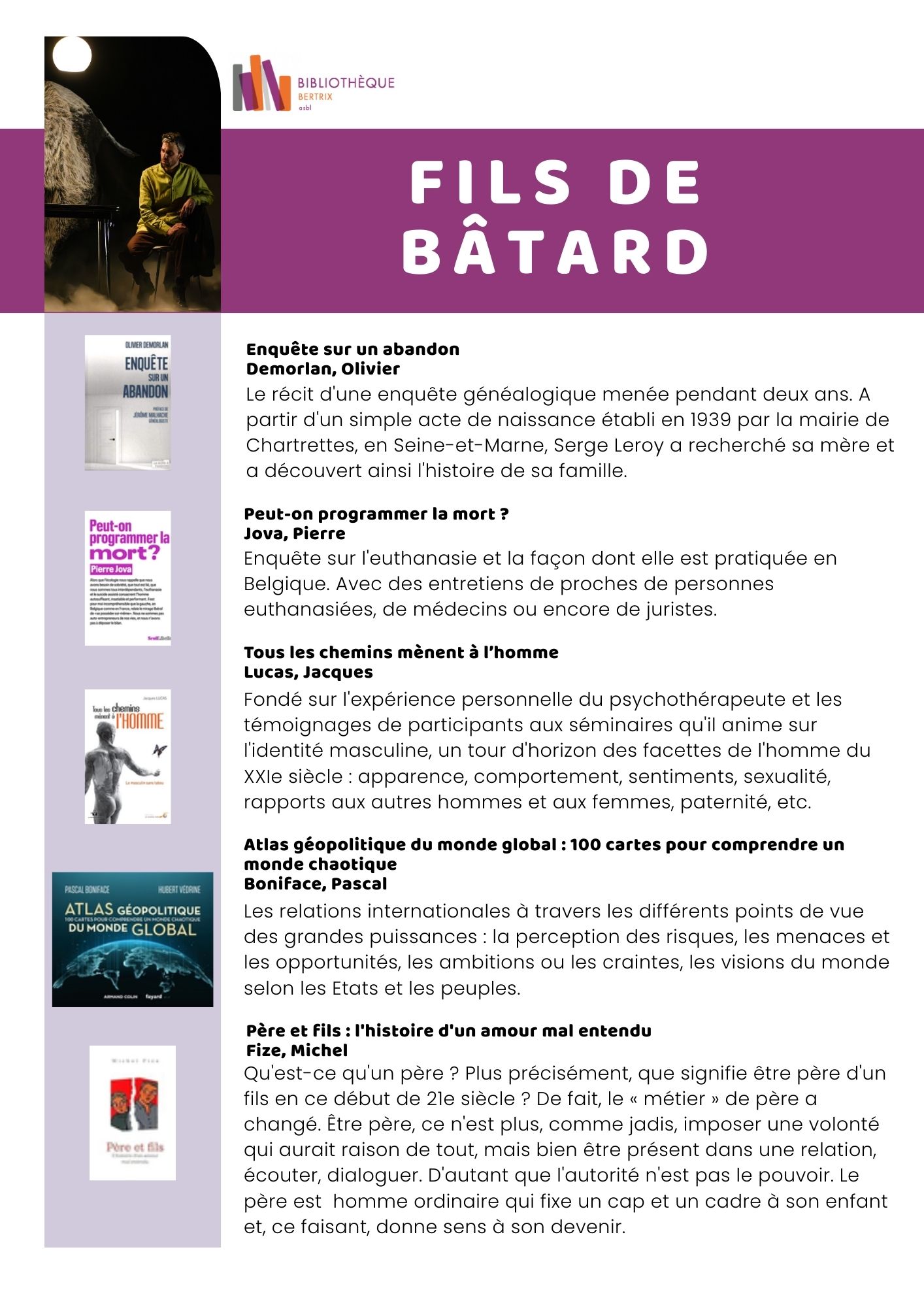 Découvrez la sélection de livres en lien avec cette programmation, proposée par la Bibliothèque publique de Bertrix